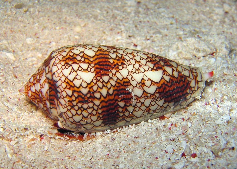 Textile cone snails are absolutely beautiful to look at, but incredibly toxic to touch. When stepped on or picked up, these sea snails have no problem jamming their teeth into humans to inject their poisonous venom. Mainly found in the Indo-Pacific region, the textile cone snail lives in the sand beneath coral and the area beneath rocks in shallower waters.