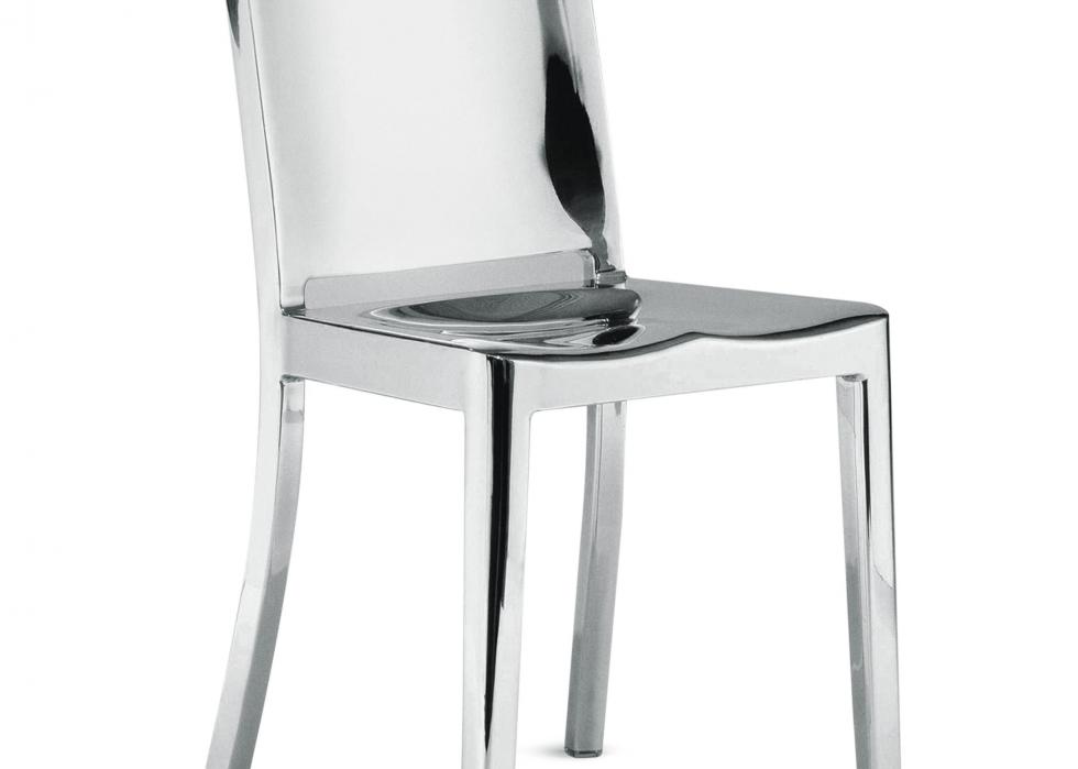 Originally designed for the Navy, mechanic Witton Dinges's Electric Machine and Equipment Co. created the indestructible-yet-lightweight aluminum alloy chair to be used on ships. Designers and architects rediscovered the chair in the 1990s, transforming it into a high-society retro nod to 1940s Americana. The rebranding saved the struggling Hanover, Pennsylvania, furniture company.