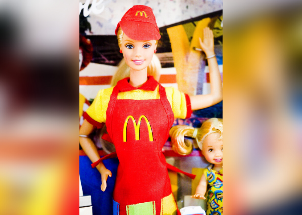 Mattel released the Barbie Loves McDonald's play set in 1982. Barbie could wear a McDonald's uniform with a hat. There was even a tiny spatula for flipping tiny burgers.