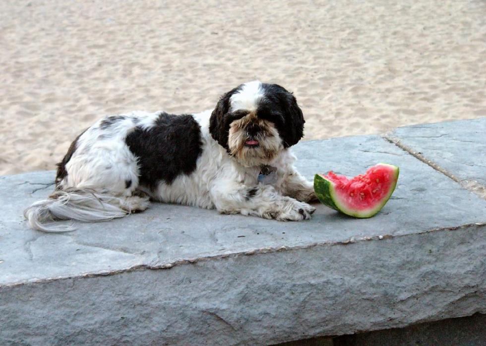 Watermelon is perfectly fine for your dog. Be sure to avoid the seeds, as they can block your dog’s small intestines, and the rind which can easily cause an upset stomach for your pet.