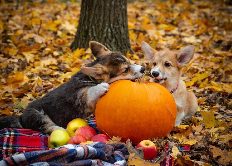 Pumpkins are a superfood for dogs. The squash can help correct urination and digestion problems, can add bulk to your dog’s stool, and can even encourage weight loss. Pumpkin is low in calories, but is packed with vitamins and fiber. Every part of the pumpkin can be fed to dogs, although one should cook pumpkin flesh first. A medium-sized dog can eat one or two tablespoons of pumpkin a day, plus a few seeds.