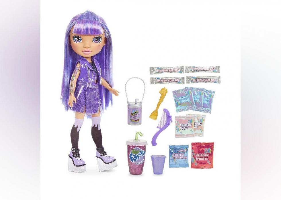 This Rainbow Surprise Doll box contains either a 14-inch Amethyst Rae or Blue Skye doll, as well as four slime powders and accessories. Each doll comes with a transparent outfit that can be decorated with the slime, resulting in an original product.