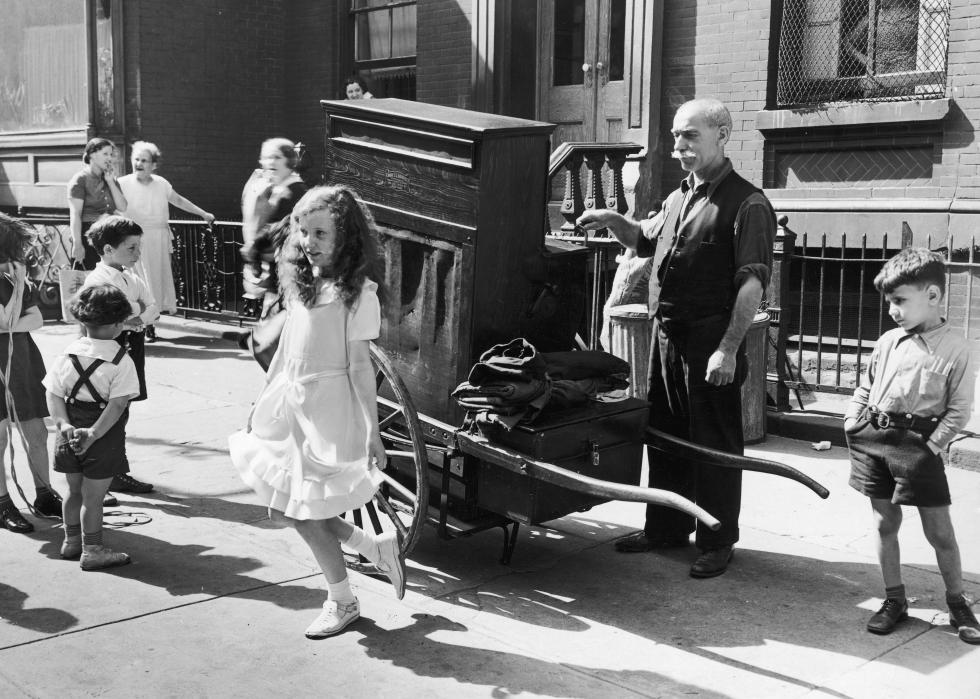 New York City organ grinders—who raised money cranking a small hand organ on the street—were fixtures a century ago. Roughly 5% of Italian men living in the Five Points section of Manhattan were organ grinders in 1880, and often had live monkeys tethered to them to draw crowds. Organ grinders were outlawed in 1936 by Mayor Fiorello La Guardia.