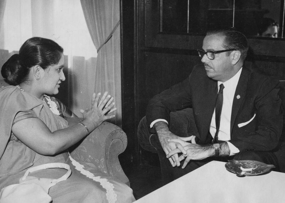 [Pictured: Prime Minister Sirimavo Bandaranaike talking with the president of the Republic of Cuba, Osvaldo Dorticos Torrado.]