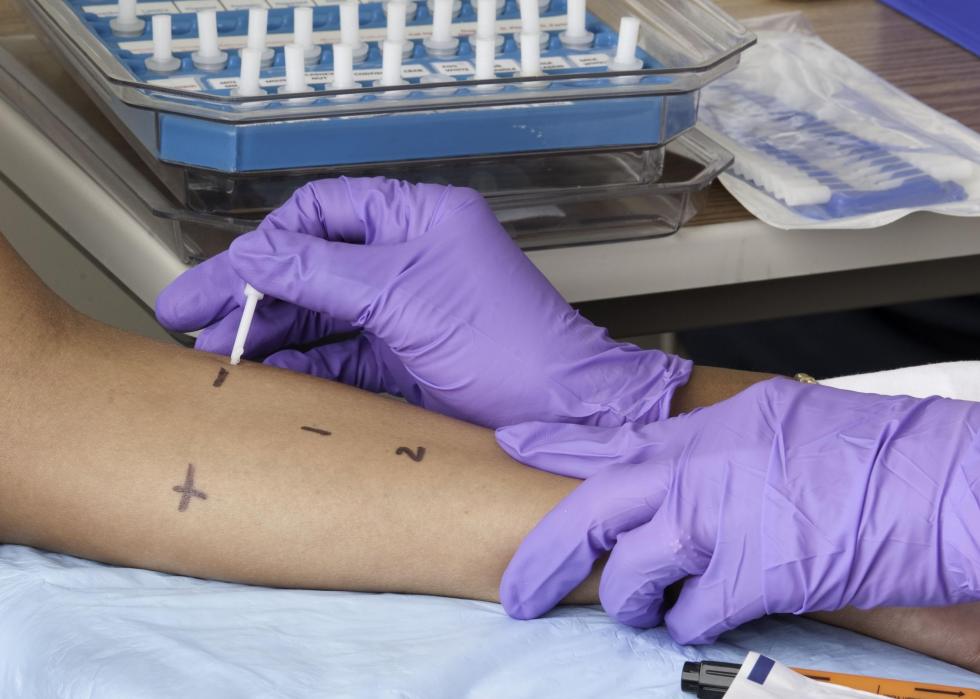 [Pictured: An allergy and immunization technician injects a patient with an immunotherapy allergen during their visit with the immunization clinic.]