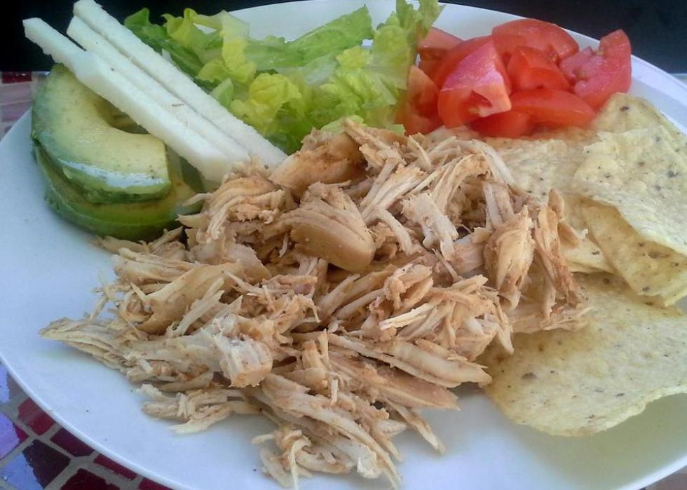Whether life is busy and hectic, requiring you to run around all day, or you’re stuck at home during a world-wide pandemic, slow cooker meals are great because they allow you to fix it, forget it, and go about your day. These shredded chicken tacos come together in the slow cooker with the help of chicken broth, a packet of taco seasoning, and 6 to 8 hours. Mix the finished product with some toppings in a tortilla or toss the meat in a soup or on top of a salad.