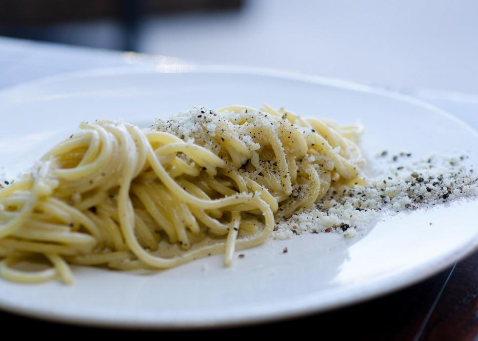 “Bucatini cacio e pepe” is a basic and easy pasta dish; the sauce is made with pecorino Romano cheese and pasta water. Created by Roman sheepherders, the classic Italian dish can be enjoyed plain or dressed up with red pepper flakes, prosciutto, or peas.