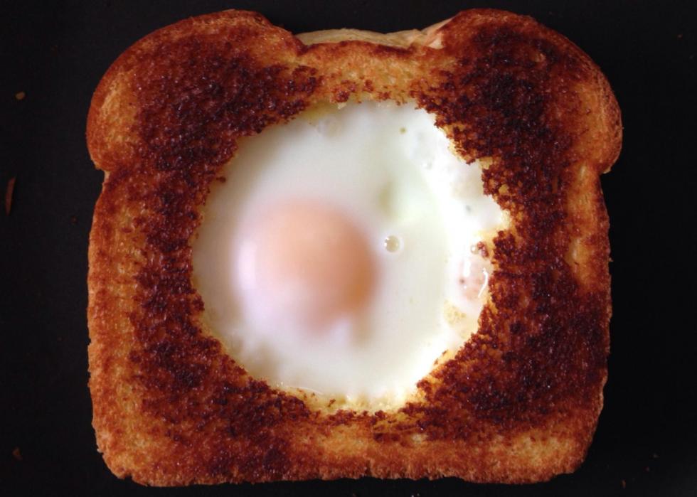 Cooking this simple breakfast in a little bacon grease really ups the flavor on this classic option. However, if you don’t have bacon grease on hand, or prefer a vegetarian variation, this runny eggs-in-toast dish can be cooked in melted butter instead.