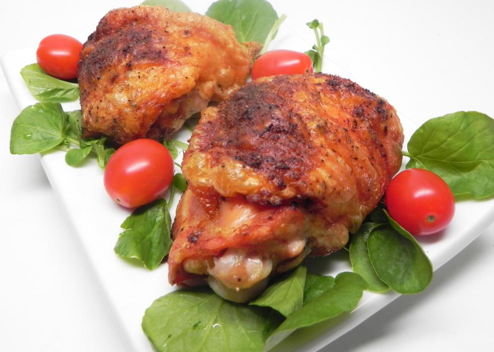 While many of the chicken-based recipes on our list so far have called for chicken breasts, this “crispy baked chicken thighs” recipe calls for a different cut of meat. Dark meat chicken thighs are often more tender and cook considerably faster. Using bone-in and skin-on thighs, this recipe results in a moist, almost “fried” tasting entree.