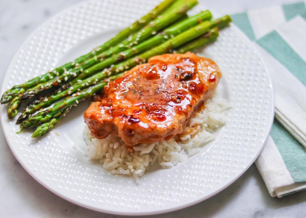 Marinades are a great way to add a little flavor to your meat without necessarily adding a ton of ingredients to the list. The marinade for this pork chop recipe is made with Italian dressing, soy sauce, and a little bit of black pepper. Cooking the pork chops on a skillet on the stovetop helps to give the outside of a meat a bit of crisp while keeping the inside juicy and tender.