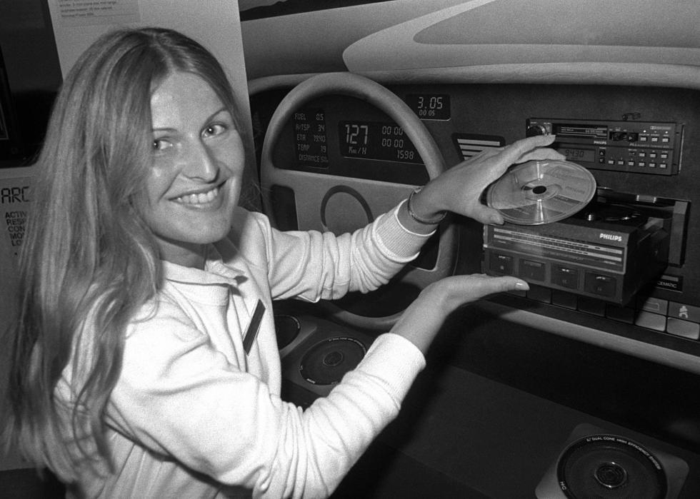 In 1985, Pioneer introduced the CDX-P1, the world’s first in-dash CD player. Compact disks were slimmer and lighter than cassettes and had no moving parts or strings of tape to turn into tangled messes. Thanks to distortion-free audio and instant track-skipping ability, CDs would soon be playing in—and for some reason, hanging from the rearview mirror of—cars everywhere.