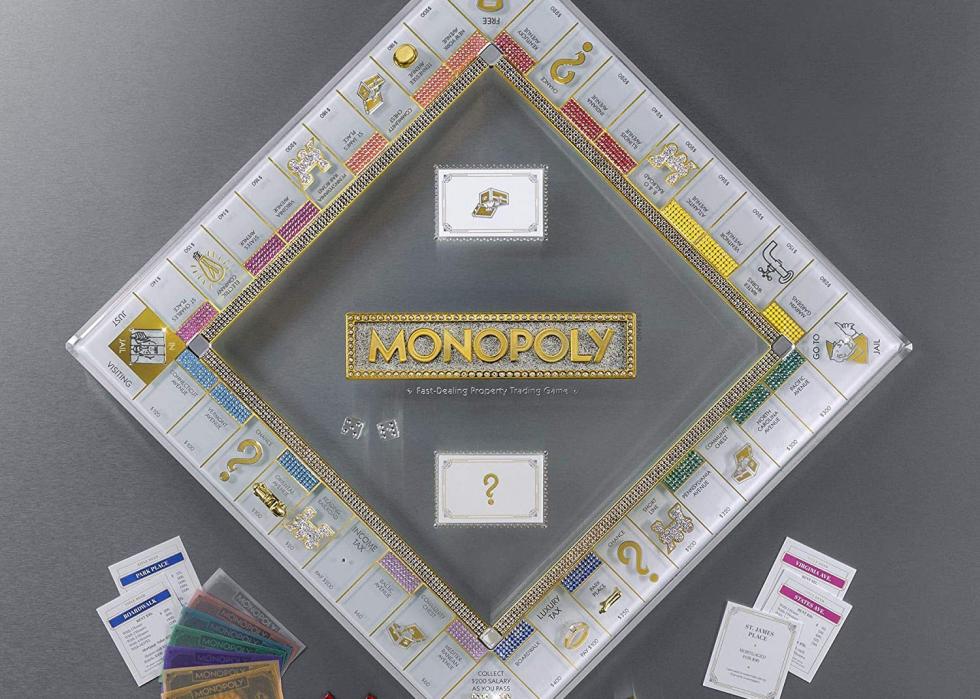 The 85th anniversary edition of Monopoly is studded with more than 2,000 of the iconic Swarovski crystals. A limited edition of 500 games, the Swarovski marries two enduring symbols of wealth. It is played on a tempered glass game board with gold and silver foil and colored stones on each property. The gold colored tokens include a special 85th edition ring token.