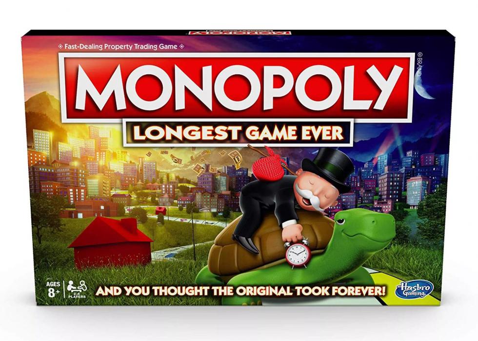 This Monopoly game is designed to be long, from the long game board with 66 properties and only one die. The game does not end until someone owns every property. With tortoise and hare tokens, the game also does not allow auctions, but does award cash for landing on free parking.