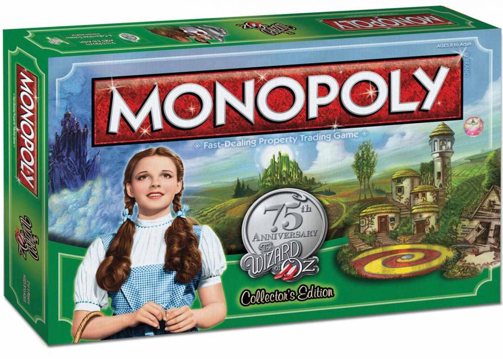The “Wizard of Oz” version includes a pop-up 3D center board, the first in a Monopoly game. Like the movie, the game’s board begins in sepia and turns into color. Red dice match Dorothy’s red slippers and the six tokens represent the movie’s characters: the Scarecrow diploma, Toto, the Cowardly Lion medal, the Tin Man’s heart, the witch’s hat, and finally the ruby slippers.
