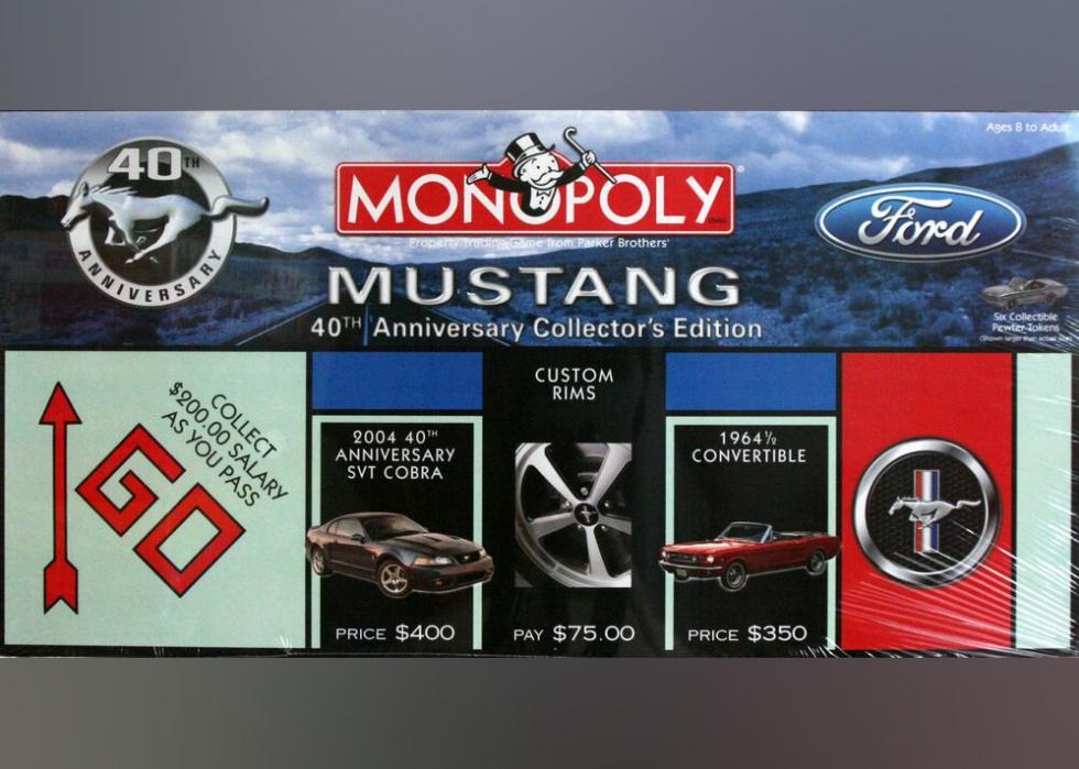 This version celebrates the Mustang, from the 1962 Roadster Concept Car to the 1965 Mustang GT to the Cobra SVT. Pewter tokens keep to the theme, among them the Mustang Pony. The center of the board holds the iconic logo of a mustang, a descendent of one of the Iberian horses brought to the Americans in the 1500s by Spanish explorers.