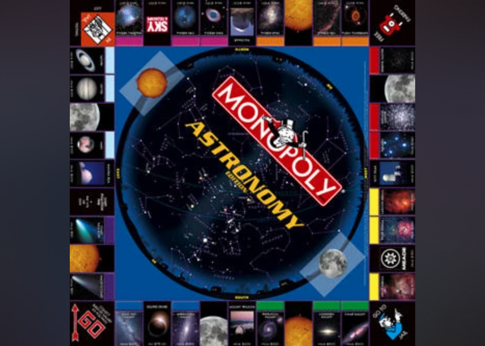 This version features space, and players buy comets, planets, star clusters, and galaxies. Planets decorate the money while the utilities are two large telescope manufacturers. The railway stations are space stations or observation domes, the Chance cards are moons, while the Community Chest cards are suns. Tokens include a lawn chair, binoculars, and telescopes.